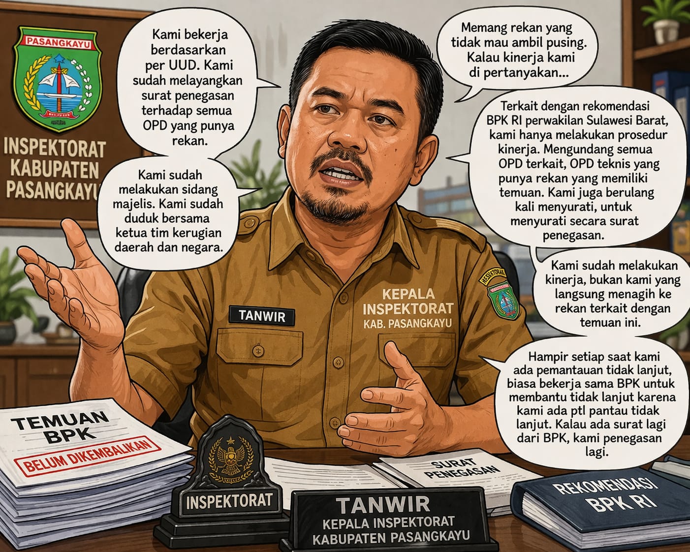 WARTAAMPERAK.COM_PASANGKAYU_))))))))))) Kepala Inspektorat Kabupaten Pasangkayu, Tanwir, menanggapi sorotan terhadap kinerja Inspektorat terkait banyaknya temuan Badan Pemeriksa Keuangan (BPK) yang belum dikembalikan oleh rekanan ke daerah.