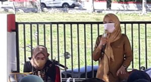 Nurjannah Samad, SIP., Kepala Desa Suruang didampingi Pendamping Desa Lokal Nuryanti (atas). Suasana pembagian BLT di halaman kantor Desa Suruang (bawah).