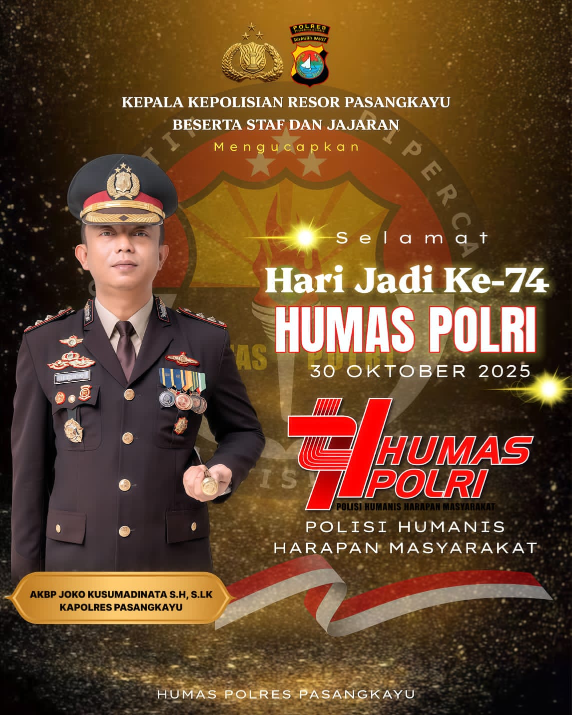 WARTAAMPERAK.COM_MAMUJU ====== Kepala Kepolisian Resor Pasangkayu AKBP Joko Kusumadinata. beserta seluruh staf dan jajaran mengucapkan Selamat Hari Jadi ke-74 Humas Polri, yang diperingati pada 30 Oktober 2025.