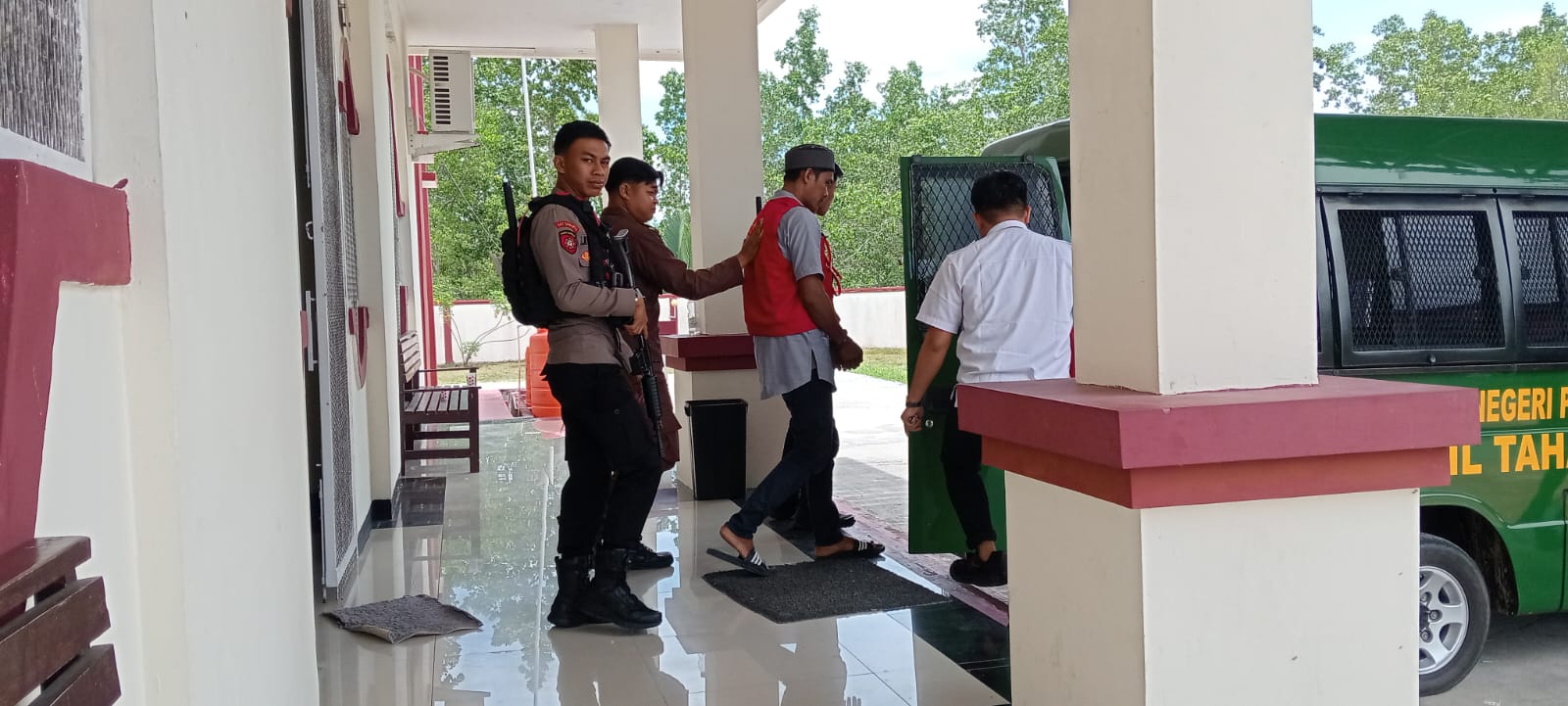 Ia kemudian digiring menuju ruang tahanan sementara sebelum akhirnya dihadirkan ke ruang persidangan.
