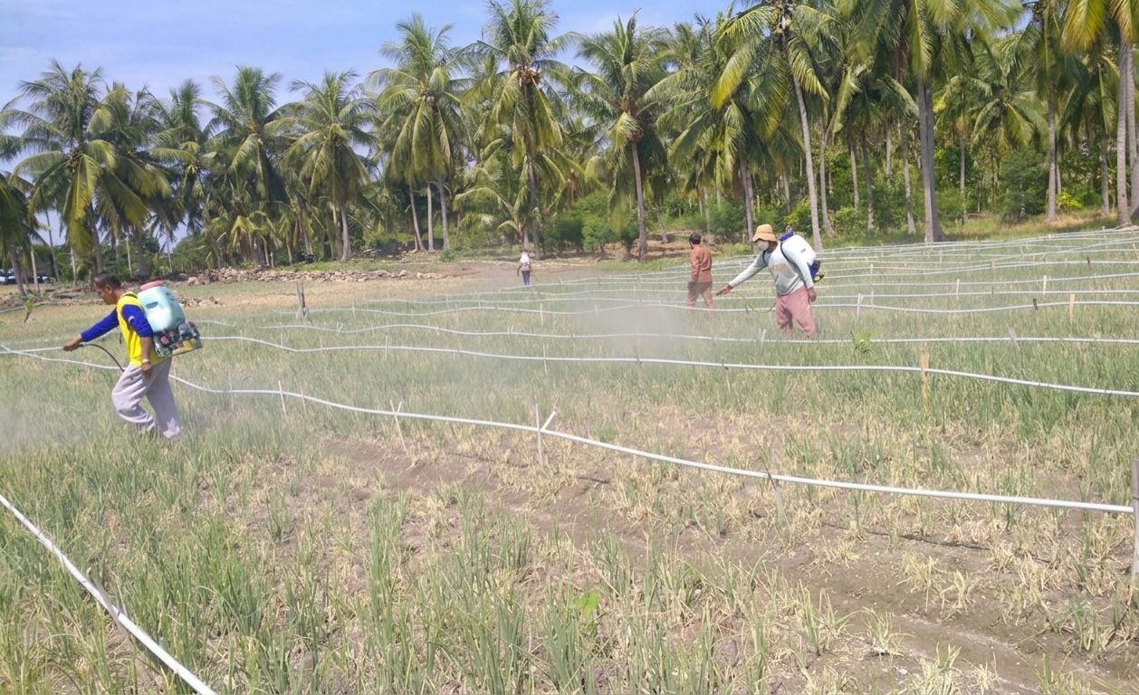 Yonatan menerangkan, bahwa terdeteksi serangan ulat grayak pada lahan bawang merah dengan intensitas serangan sekitar 40 persen di umur tanaman 50-65 HST dengan total luas serangan mencapai 43 hektare, sehingga petani melakukan kegiatan pengendalian ini untuk mencegah kehilangan hasil yang lebih tinggi.